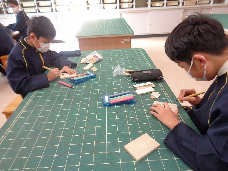 6年生は、小学校生活が残り3ヶ月となり、中学受験に向けてみんなで協力して取り組んでいます。また、少しずつ卒業に向けての準備も始まり、図工の時間には「卒業制作・ペン立て作り」をしています。6年間の思い出をもとに、一人一人考えたデザインを彫刻刀で彫り、色付けをしていきます。完成が楽しみです。