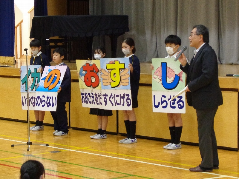 今回は、スクールサポーターの方をお招きし、万が一に備えて「自分の命を守るための行動」について、プロの視点からご指導ををいただきました。児童たちは、緊張感を持ち、静かに迅速に避難行動をとることができました。
