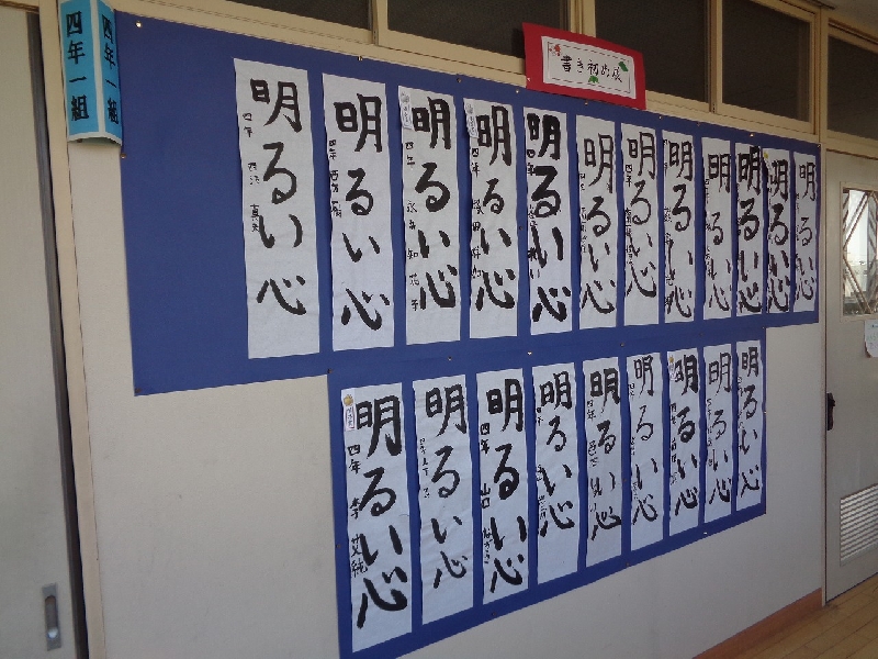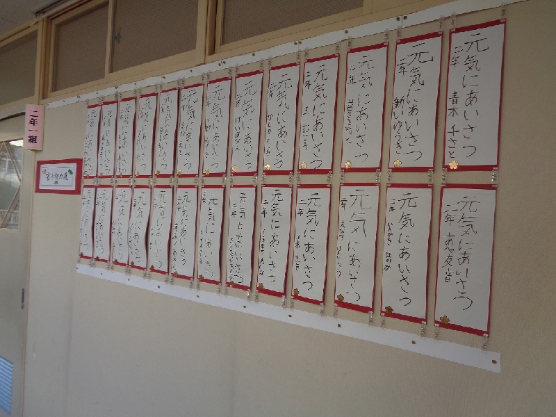 3学期の始めから、廊下に書き初めの作品を展示しています。