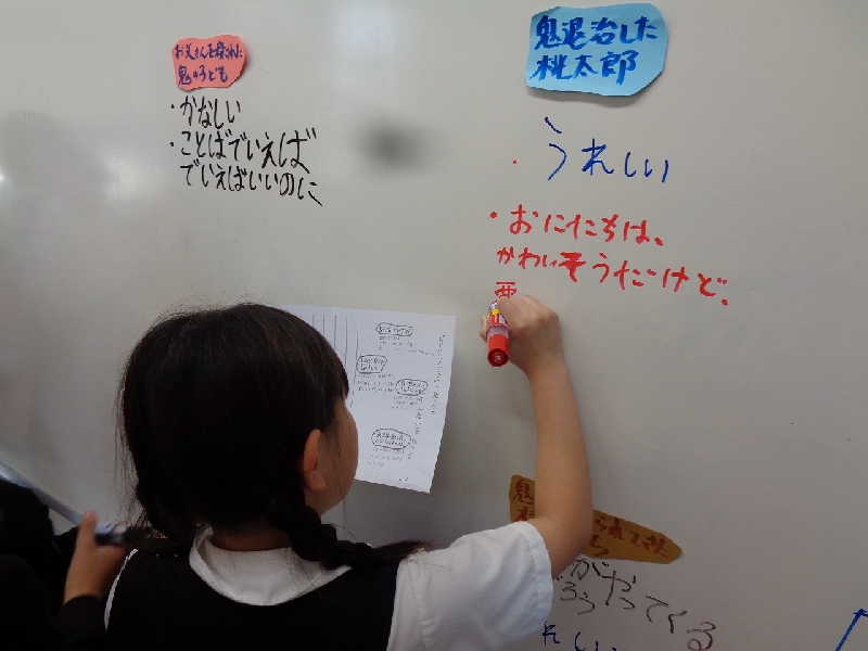 桃太郎と鬼、それぞれの立場に立ち、鬼の家族の思いや宝物の意味などについて考える中で、子供たちは活発に意見を出し合いました。同じ出来事でも、見る角度が変われば、感じ方や考え方が変わることに気づくことができました。