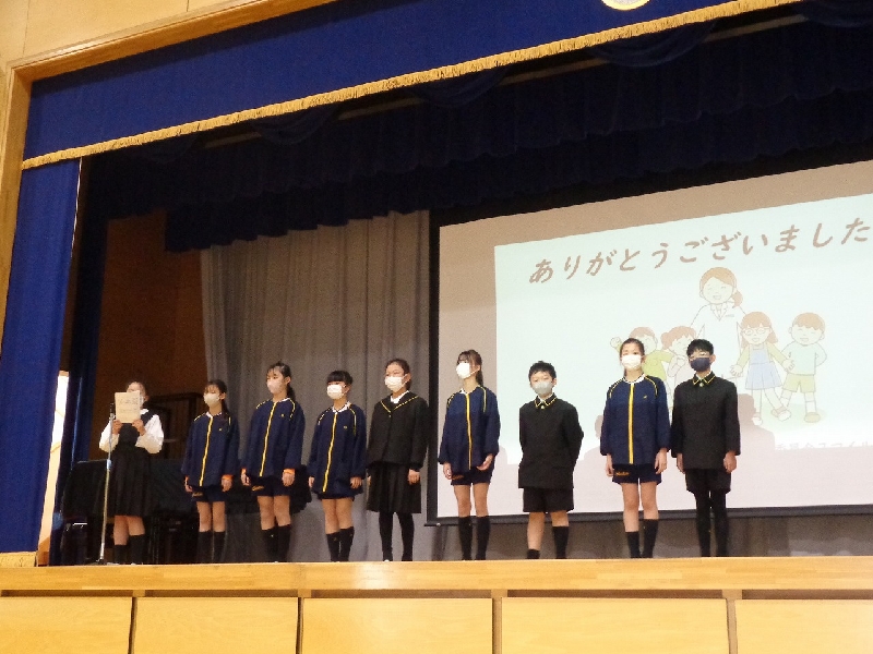 クロージングでは、写真のように3年生と5年生の代表児童による「2学期に頑張ったこと」の作文発表、学級賞、校長賞の表彰、校長先生の話がありました。クロージングの後には、生徒指導主事の先生の冬休みの過ごし方のお話もあり、時間もかかりましたが、さすが6年生、最後までしっかりとした態度で式に臨めました。