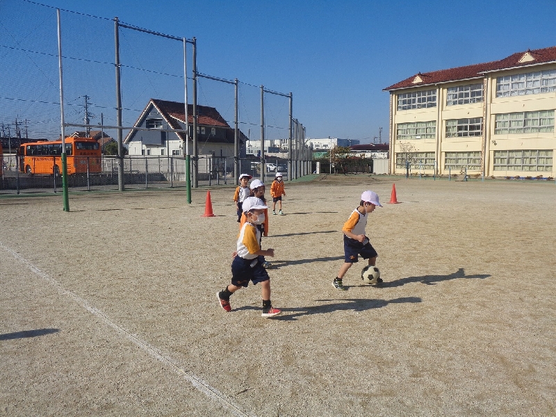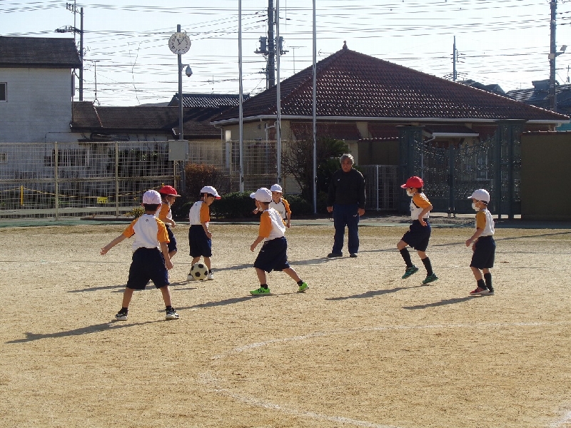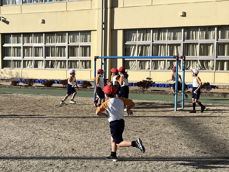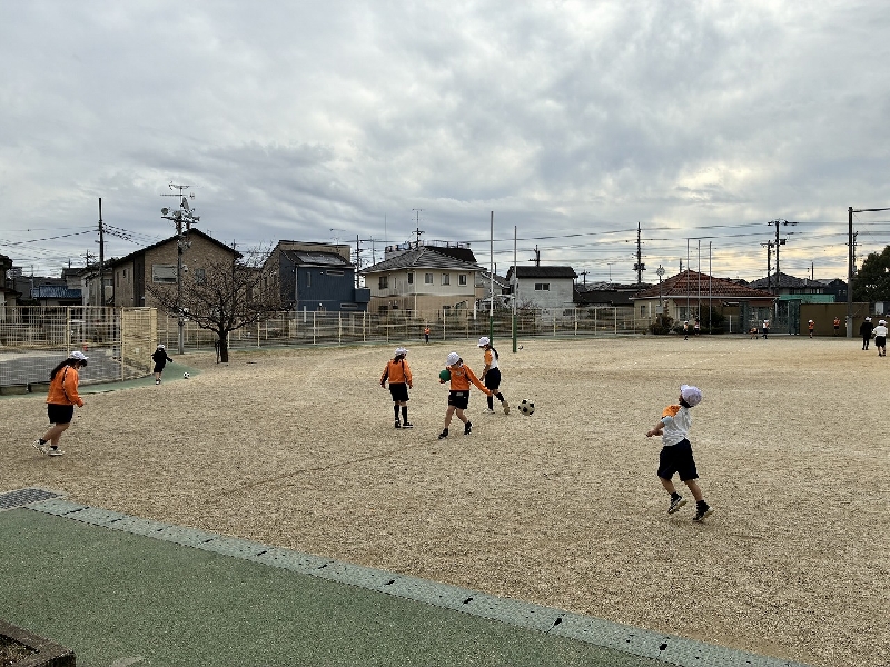 みんなが全力を出し切って頑張ったマラソン大会の後、1年生の体育では、サッカーを学習しています。インサイドキックで友達とパスをし合ったり、チームに分かれて試合をしたりしています。サッカー経験者も、初めてサッカーをする児童も、声をかけ合って上手にパスができるよう練習しています。