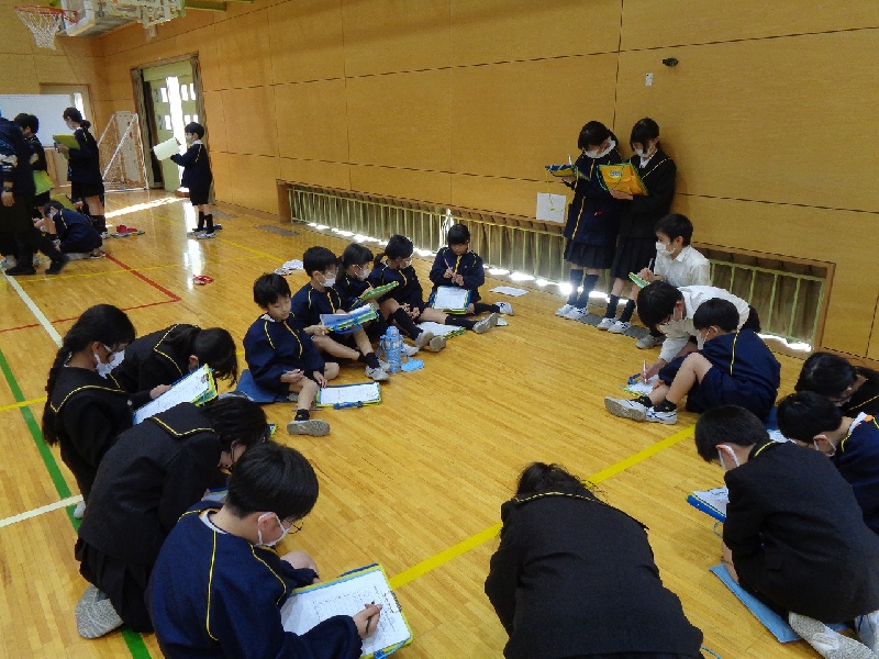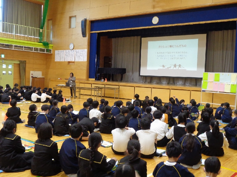 齊藤先生の全校道徳、『人間が生きていくために必要なものは何だろう』の授業が行われました。授業の中では、「新しい大陸に向けた航海」に「必要なもの」を一人一人が考え、それをたてわり班の中で意見交換をしました。その後、各班の代表者が班の中で出てきた意見を全校児童の前で発表しました。お互いに発表を聴き合う中で、「他の班の人の意見も素敵だと思った」、「『物』だけでなく、『心』や『環境』なども必要なんだ、と思った」という感想が述べられていました。一人一人が課題についてよく考えるとともに、違う意見にもしっかりと耳を傾け、それぞれがじっくり考えることができた授業でした。