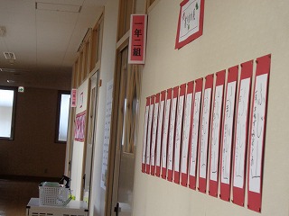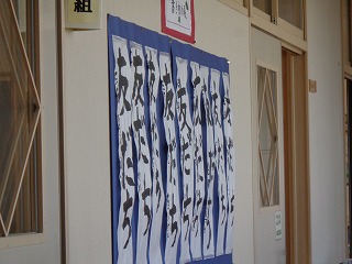 3学期の始めから、廊下に書き初めの作品を展示しています。