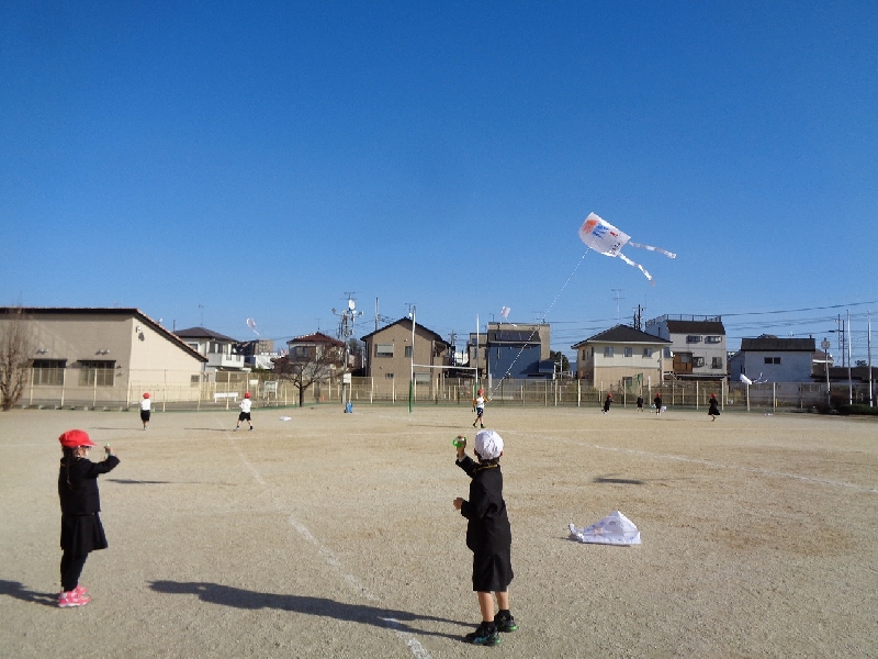 ビニールだこに、富士山や馬など自分の好きな絵を描いて仕上げました。手作りのたこが風に乗って、高くあがっていくのを楽しむことができました。強い風にあおられたり、糸がからまったりして苦戦する場面も見られましたが、だんだん上手にあげられるようになりました。「たのしかった。家族ともやりたい。」「もっと、高くあげたい。」などの声が聞かれました。