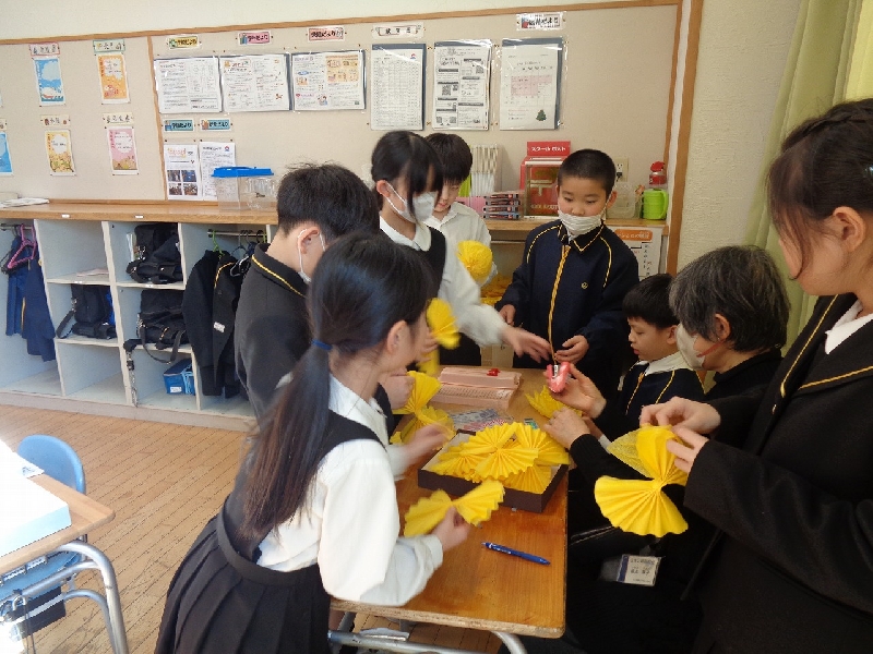 3年生では送る会の装飾作りを始めました。送る会の会場を華やかに彩るお花を作っています。今日は黄色のお花を作りました。「次は何色を作ろうか。」「花びらをしっかり開いてきれいなお花にしようね。」などと話しながら楽しく作っています。