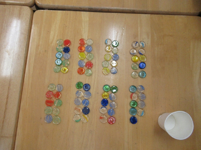 「大きな数」の導入に、「お箸でおはじきを取る競争」をグループになって行い、取れたたくさんのおはじきを数える学習をしました。始めは、どのグループも一・二・三・四・・・八十六と数えたり、おはじきの色ごとに数えたりしていましたが、グループで話し合ったり、他のグループを見たりしながら、もっと良い数え方がないかみんなで考えました。そして、10のまとまりを作って数えると良いことや、10のまとまりをきれいに並べたりすると数えやすいということに気付き、更に工夫して数えることができました。どの子も、いきいきと楽しみながら活動する姿に好感がもてました。